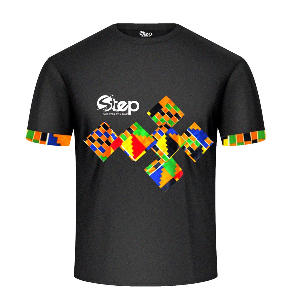 Step black T-shirt with bold blue and orange tribal square patterns – modern African-inspired streetwear.