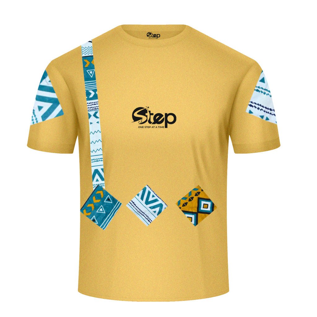 The “STEP – Tribal Horizon” t-shirt brings a refreshing blend of tradition and contemporary style. The soft sand beige base sets the tone for striking blue-and-gold tribal-inspired patterns across the shoulders, vertical chest strip, and geometric front panels.