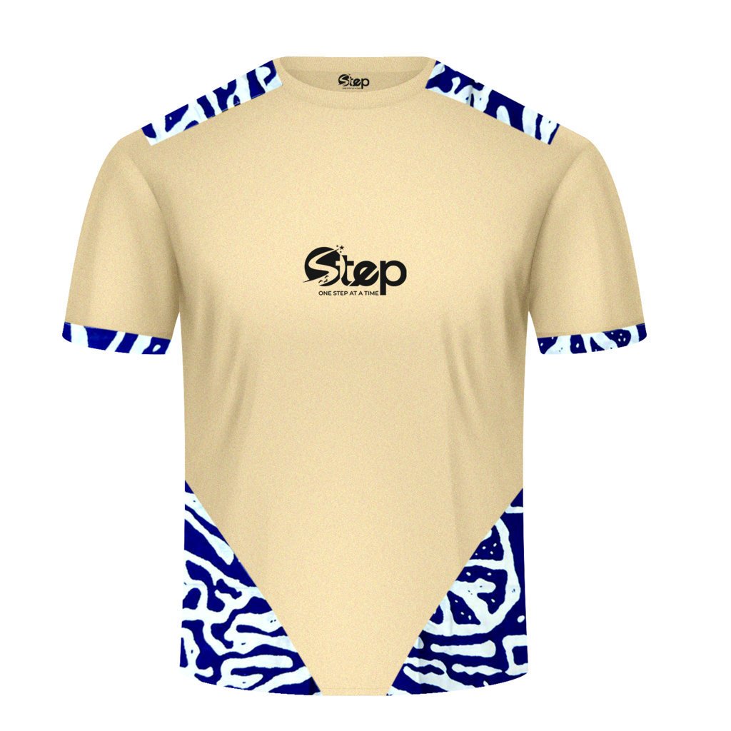 Celebrate style with culture in this beige STEP T-shirt featuring colorful blue tribal-inspired patterns. The high-quality fabric ensures comfort, while the bold print adds a creative and unique edge to your outfit. Perfect for those who love mixing modern streetwear with traditional influences. Ideal for festivals, casual gatherings, or vacation wear.
