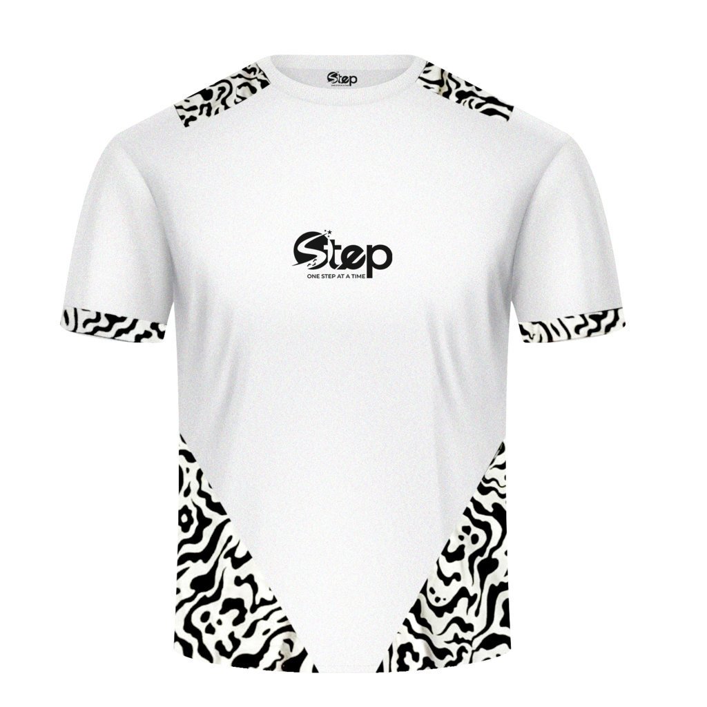 Minimalist white STEP T-shirt with bold black abstract prints — stylish, breathable, and perfect for everyday wear.